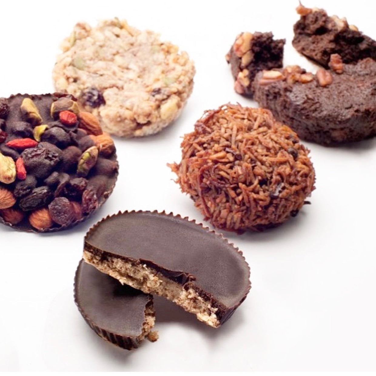 You'll get to try the following Treats: The Bandito (an almond butter chocolate cup), the Brownie Bomb (like flourless chocolate cake), the Cacao Now (a chocolate, fruit, and nut bar), the Mac Attack (a macaroon or coconut cookie), the Mustang Bar (our best selling combo of oatmeal raisin taste with granola texture) and the Rocket (an espresso brownie.)