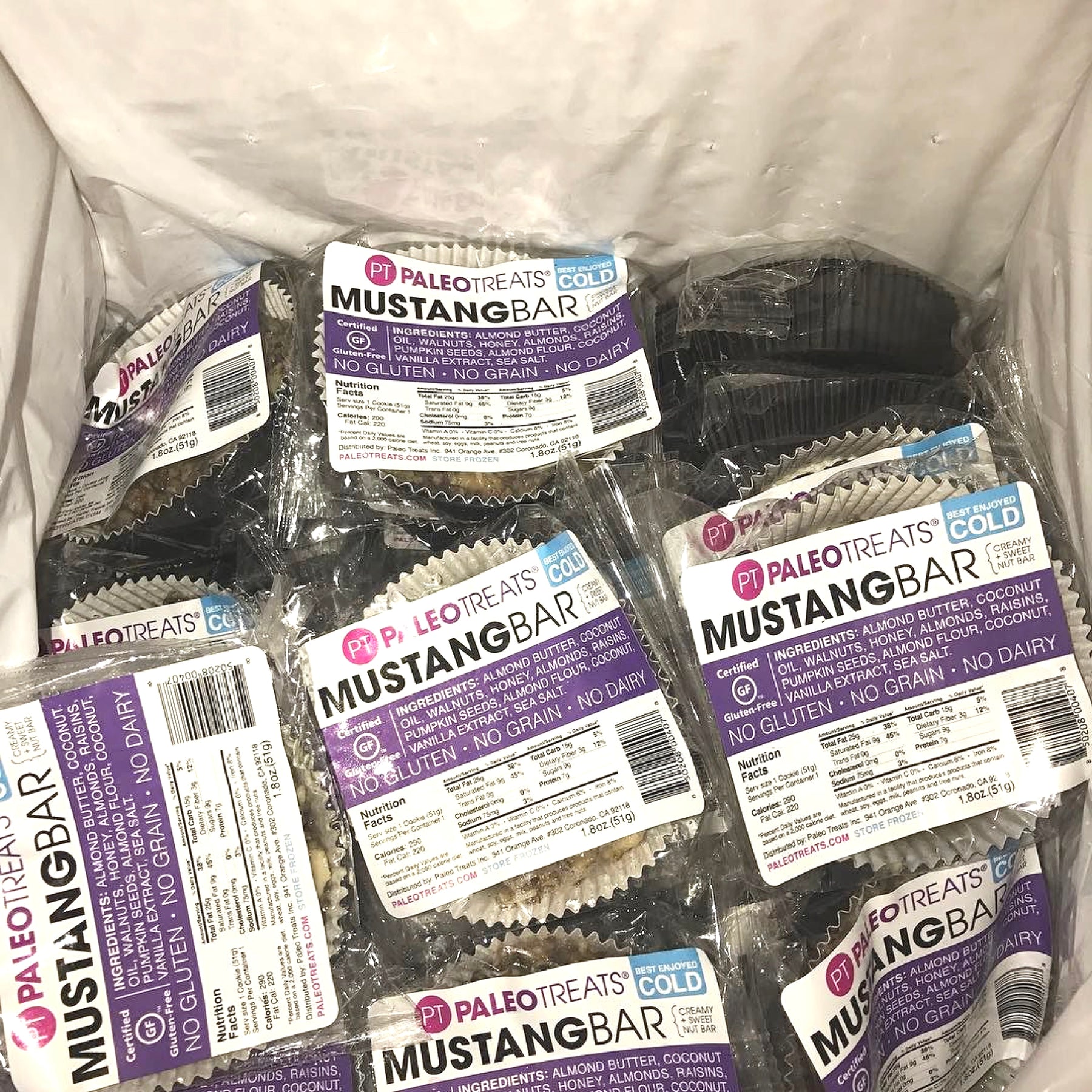 The Mustang Bar is one of our best selling Treats. Mustangs are a mix between granola, cookie dough, and an oatmeal raisin cookie, while staying strictly Paleo.